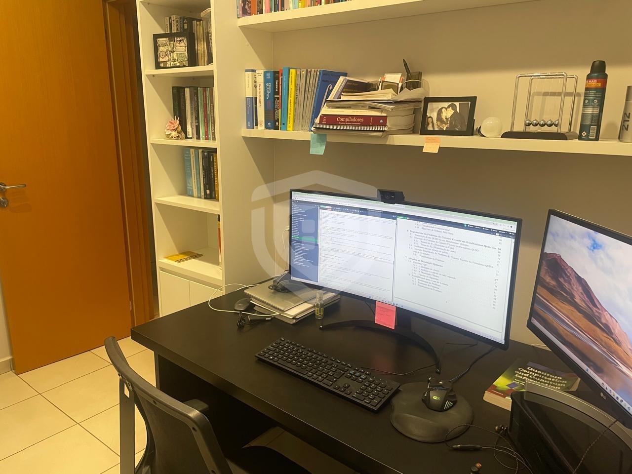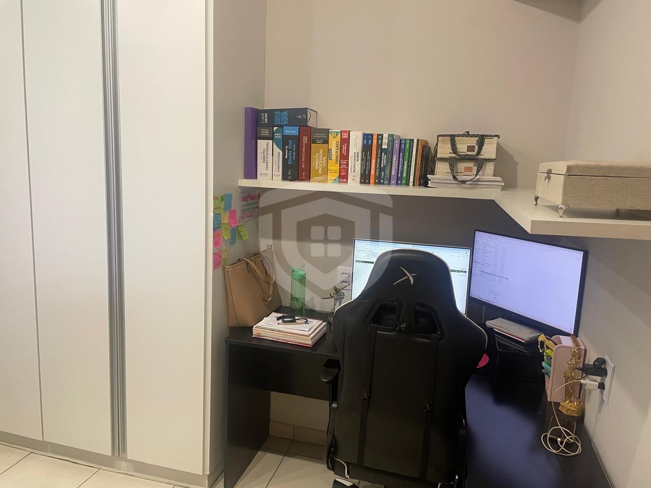Apartamento com 2 quartos, ambos com armários completos, sapateira e estante para livros. Um dos quartos foi montado como escritório, mas pode facilmente acomodar uma cama.