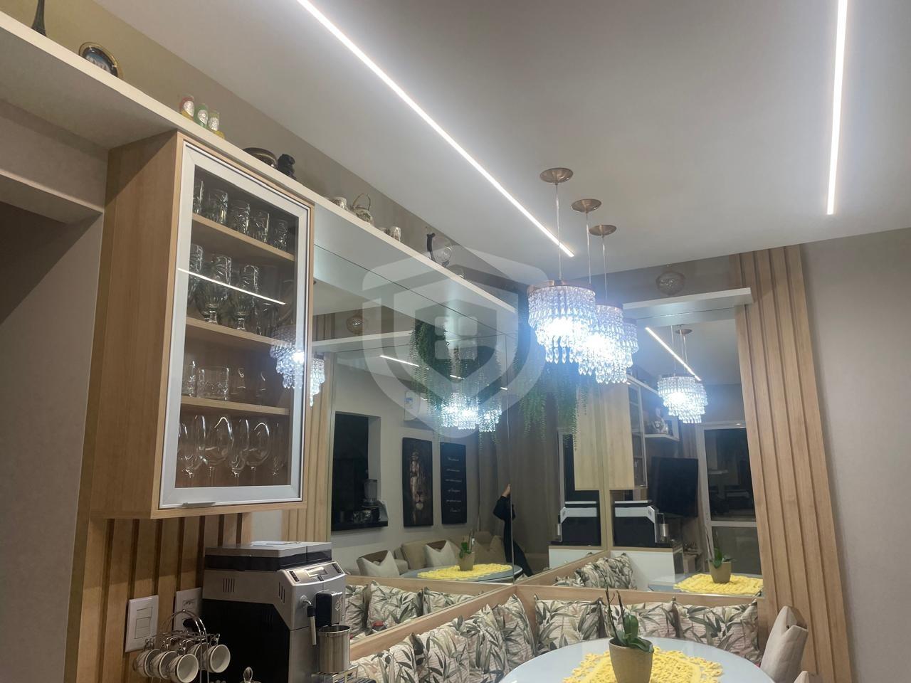Sala com móveis planejados, canto alemão com baú, três tipos de iluminação, incluindo sanca invertida. Sacada.